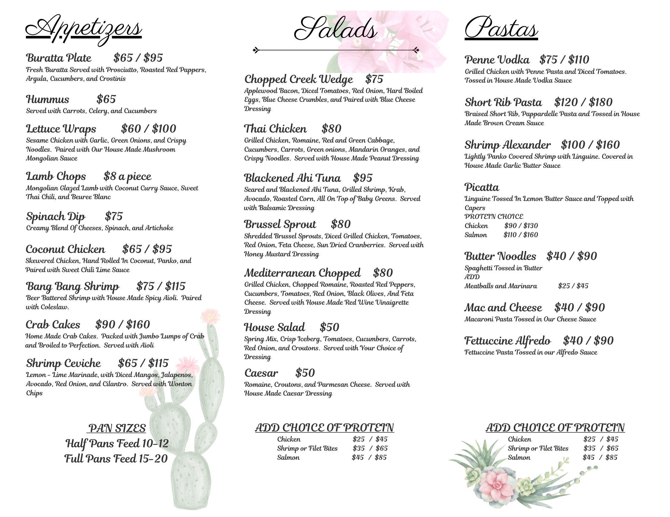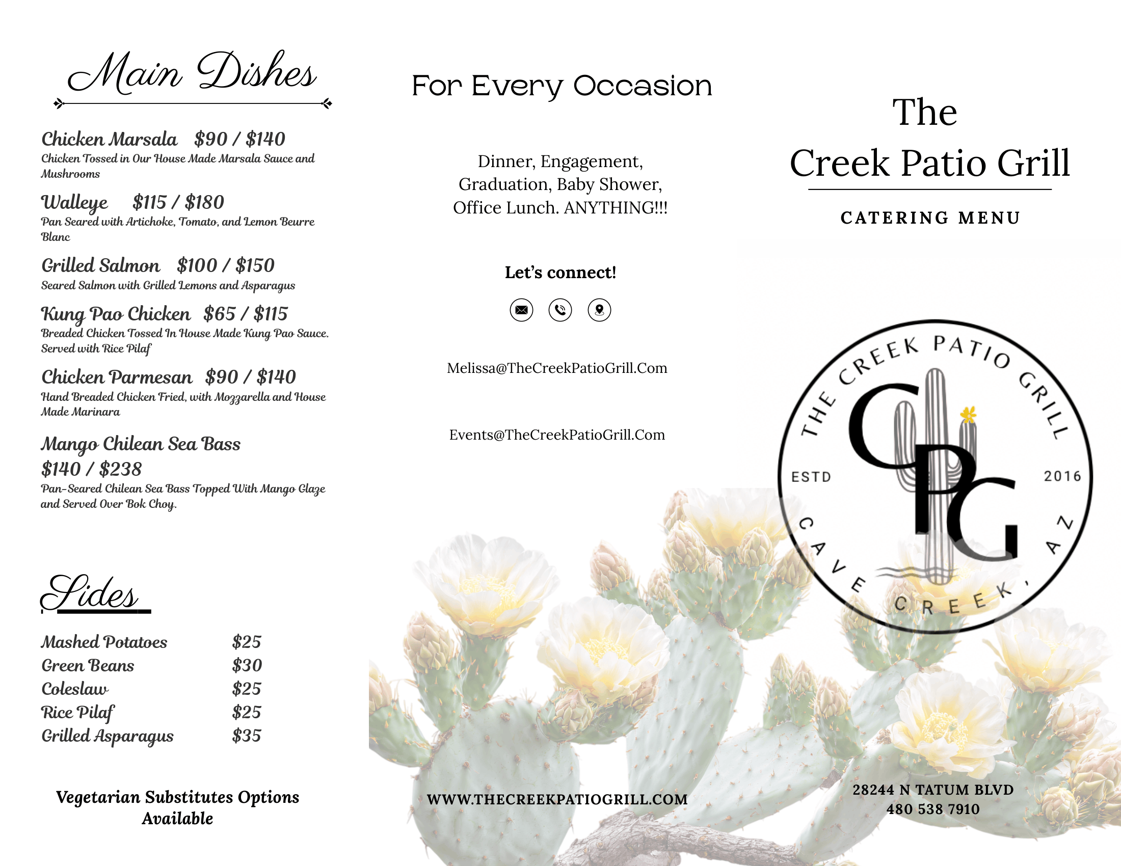 From office lunches to family celebrations, The Creek Patio Grill can help make your event effortless and memorable. Browse our catering options below and reach out to our team by phone or email to get started.